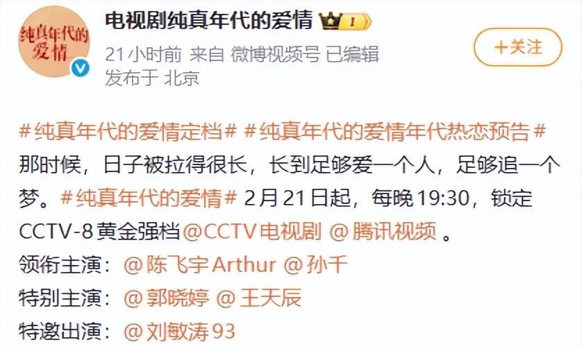 然而就在2月11日,央视一套正式官宣:由陈飞宇与孙千联袂主演的年代情感大剧《纯真年代的爱情》,确定登陆CCTV-8黄金剧场。
